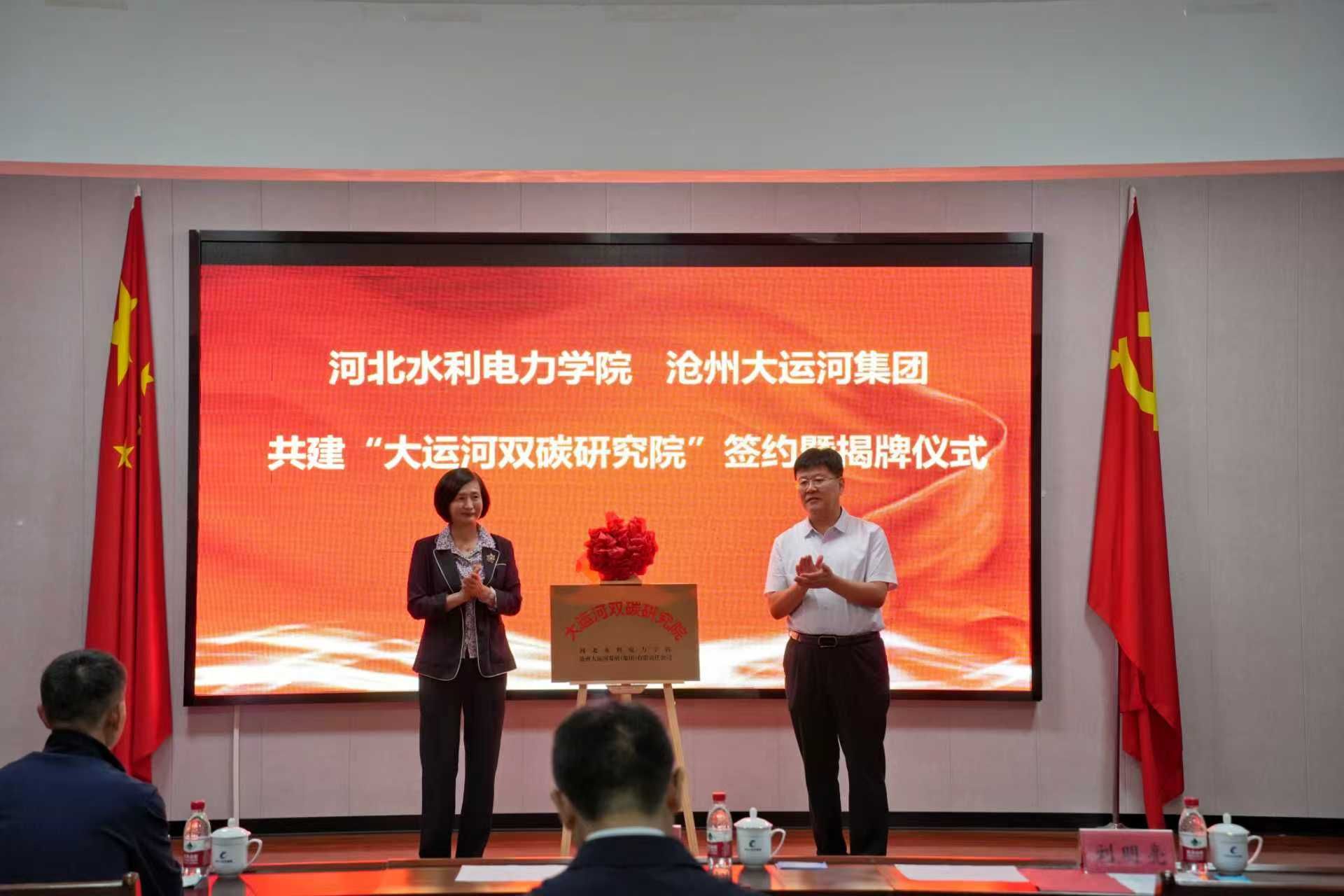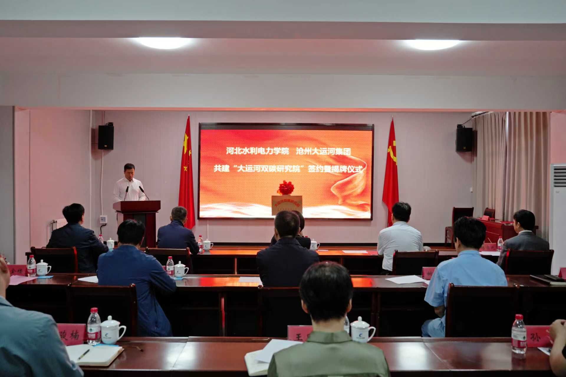 9月26日上午,由沧州大运河集团与河北水利电力学院携手共建的“大运河双碳研究院”在沧州大运河发展(集团)有限责任公司正式揭牌成立,标志着沧州市在深入落实国家“双碳”战略、推动绿色科技创新方面迈出关键一步。成立大会暨签约揭牌仪式由沧州大运河集团党委副书记、总经理王金楼主持。沧州市国资委党委书记、主任冯艳玲,沧州市科技局党组书记刘明亮,河北水利电力学院党委副书记、校长王滨,沧州大运河集团党委书记、董事长李宗兆等领导嘉宾共同出席见证。